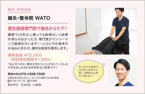 鍼灸整体院 WATO院長の野口歩先生は、法政大学スポーツ健康学部を卒業後、スポーツトレーナーとして活躍する一方、鍼灸師の国家資格を取得し、慢性腰痛や下肢痛などに対して、科学的なアプローチで原因を調べ、ストレッチのみではなく多彩な施術に加えて鍼灸療法も応用して、多角的な取り組みで症状の改善をはかっています。